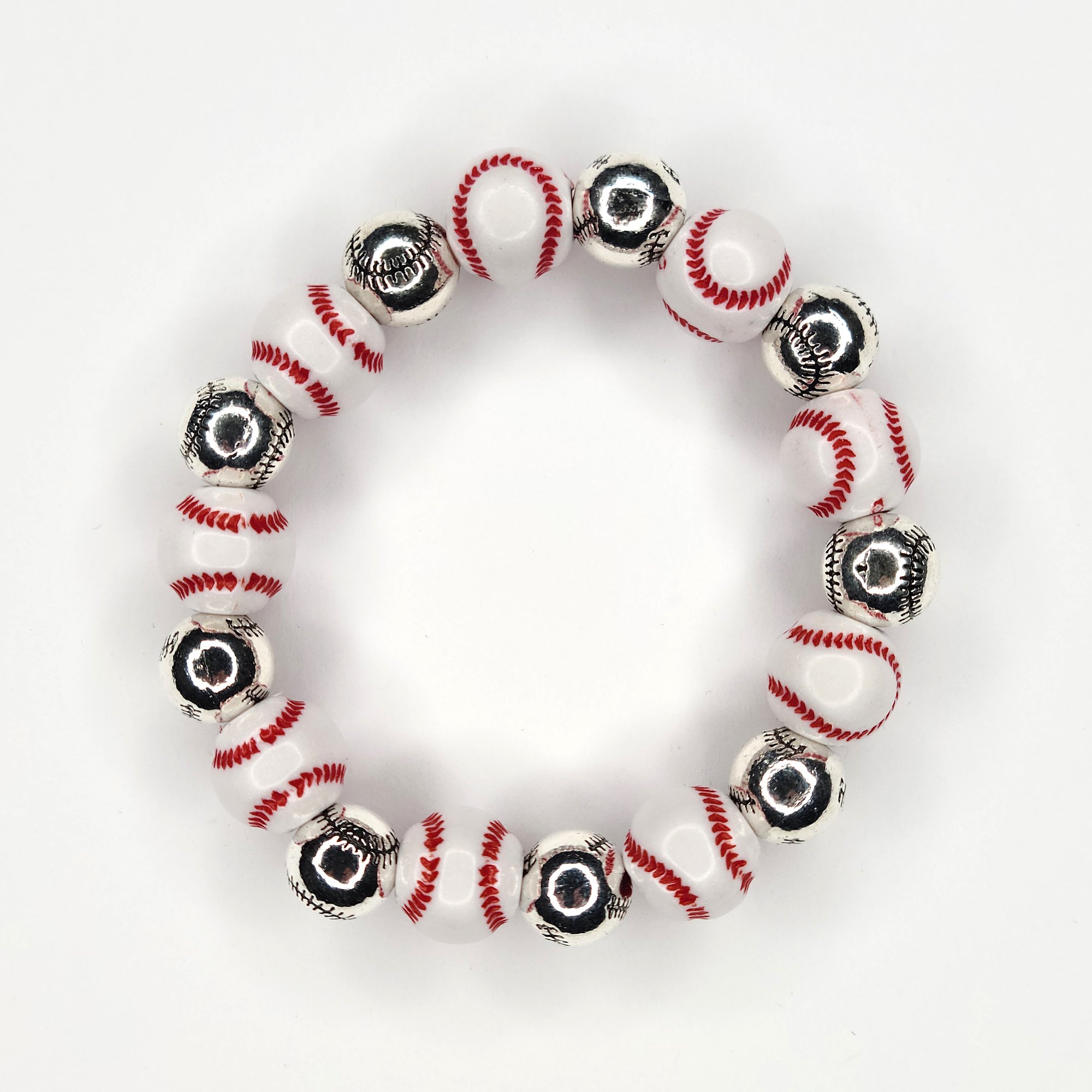Features the traditional white and red seam baseball beads alternating with stunning silver baseball beads on a stretchable and resilient bracelet.