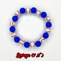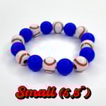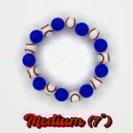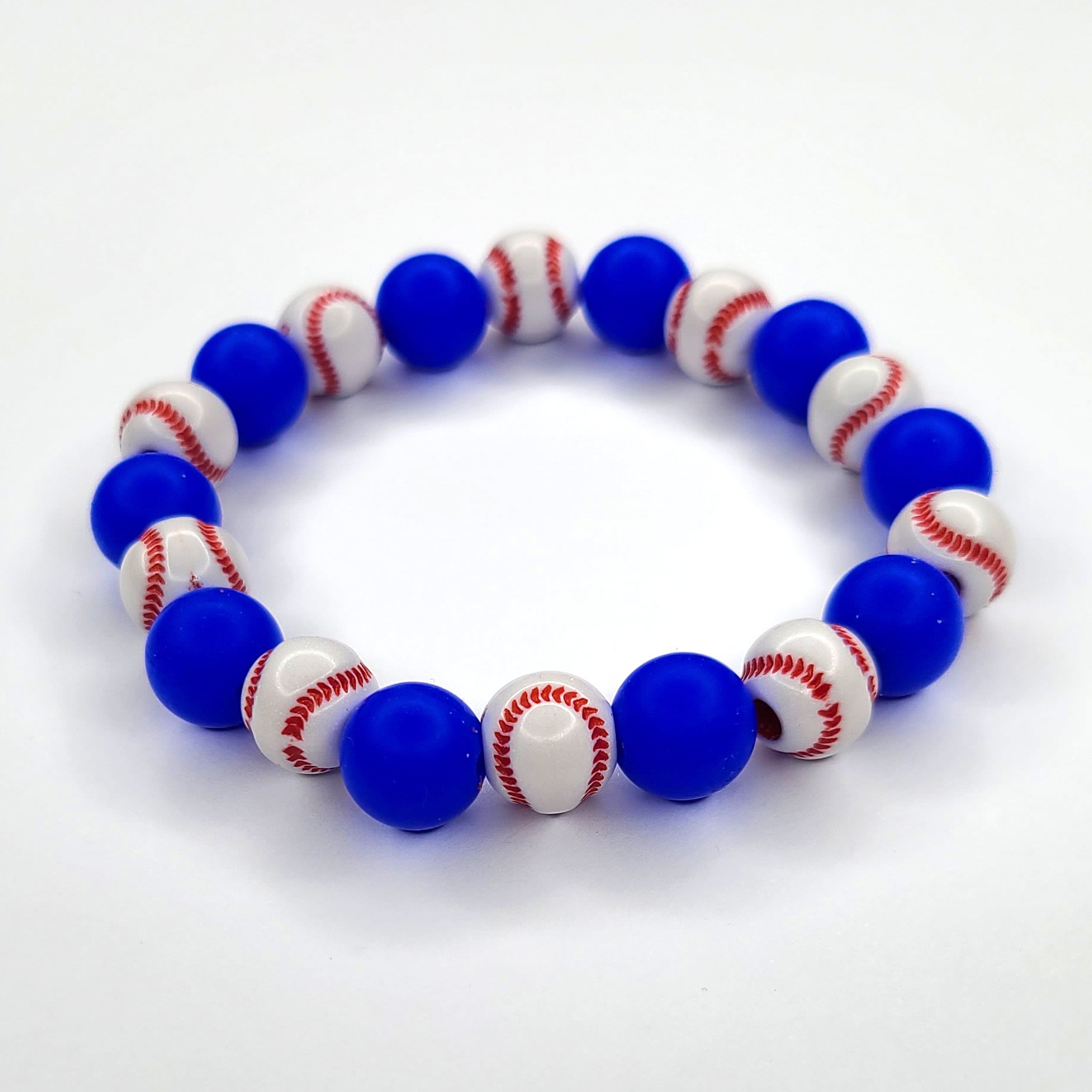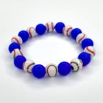 Features the traditional white and red seam baseball beads with alternating beautiful blue soft beads on a stretchable and resilient bracelet.