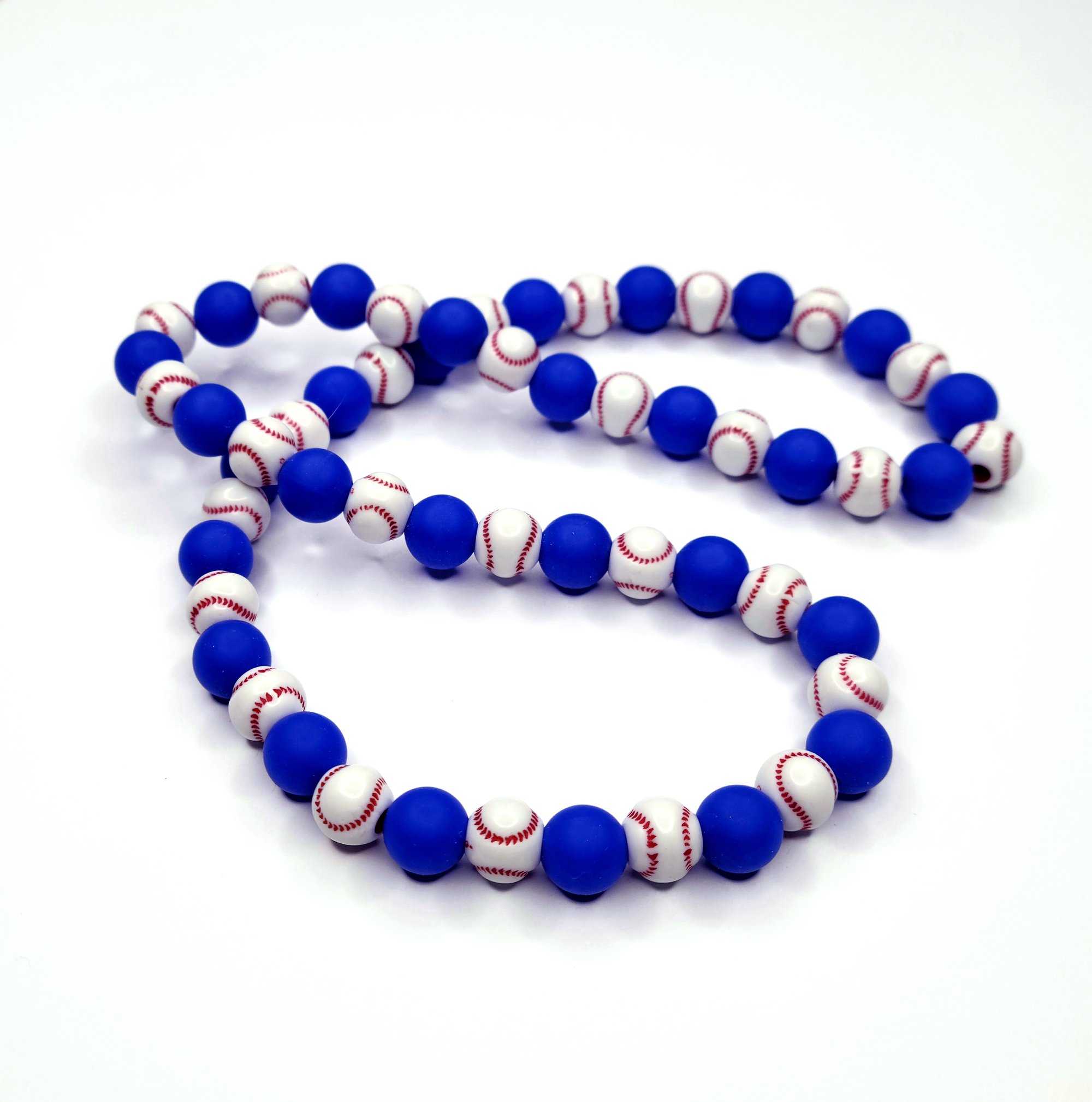 Features the traditional white and red seam baseball beads with alternating beautiful blue soft beads on a stretchable and resilient necklace.